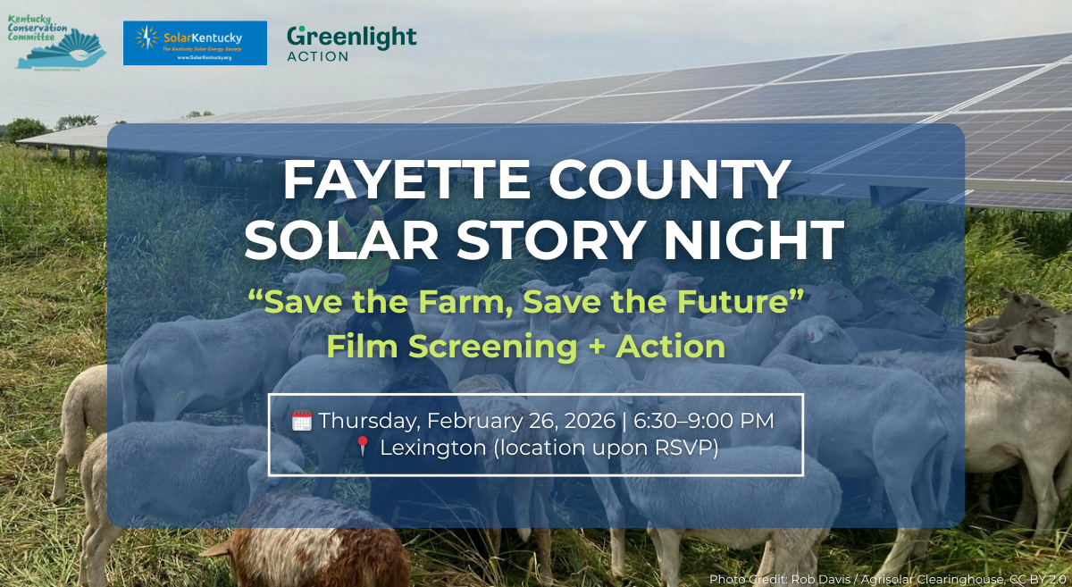 Movie Night! KCC and our friends at Solar Kentucky and Greenlight Action are hosting a film screening of a film called “Save the Farm, Save the Future” on Thursday, February 26th. With so much controversy over solar and farmland, we wanted to share this film that addresses what is happening with projects that are working toward collaborative solutions. We hope you will join us in Lexington. Please register for the film event here.