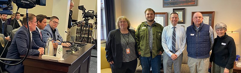 Left Photo: Florida’s Governor DeSantis lobbies for changing the U.S. Constitution. Right Photo: KCC’s Director, KCC member Gail Lincoln, and citizens from “We Are Mason County” discuss data centers and pipelines with Senator West.
